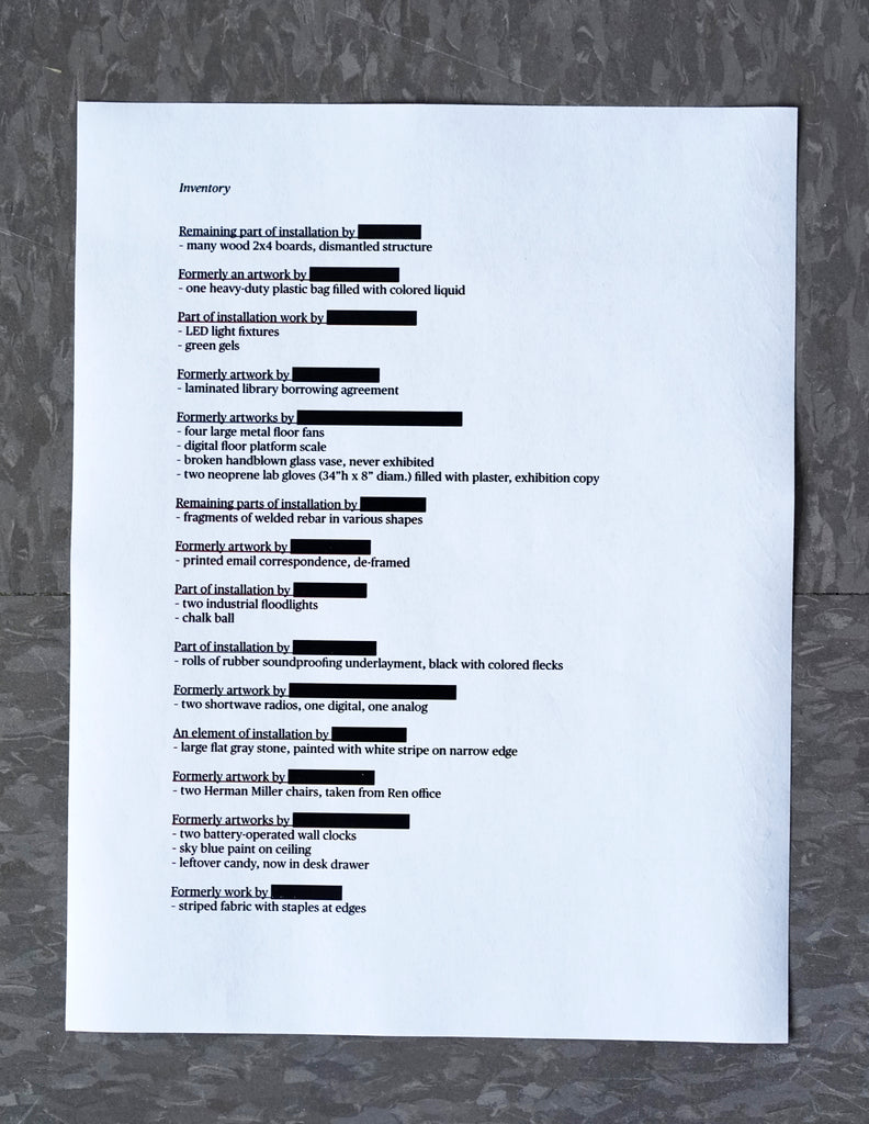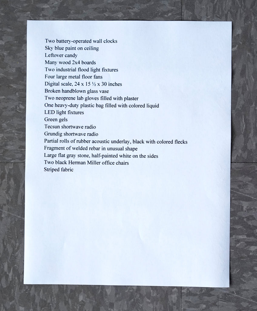 This limited edition by Ghislaine Leung consists of various objects that trail in the wake of her solo exhibition at the Renaissance Society in 2024. Leung’s show at the Ren consisted of a set of new “scores”: concise phrases, written by the artist, that describe the materials and implementation of a given work, which the institution then interprets and enacts on site. While developing her shows, Leung often starts with a much larger set of scores that change and coalesce over time. Leung has referred to her practice as subtractive, a permissive system that is by nature inefficient; everything is brought in and then much removed. As part of this editorial process, Leung and the Ren started acquiring materials for far more works than were presented, amassing an array of items that were never used. These surplus items hint at other forms the show might have taken: motion sensors, prairie dresses, glow-in-the-dark paint, a handmade doll, a microphone, a radio, two versions of an institutional “inventory.” Becoming an artist's edition, they attest to Leung’s continued attempt to achieve more sustainable practices, inverting value systems around objects and labor that are often considered secondary. The objects that constitute the Renaissance Society Edition are traces of works that didn't happen—but perhaps more importantly are also traces of unseen working that did. Together, they begin to tell an alternate history of her exhibition at the Ren.