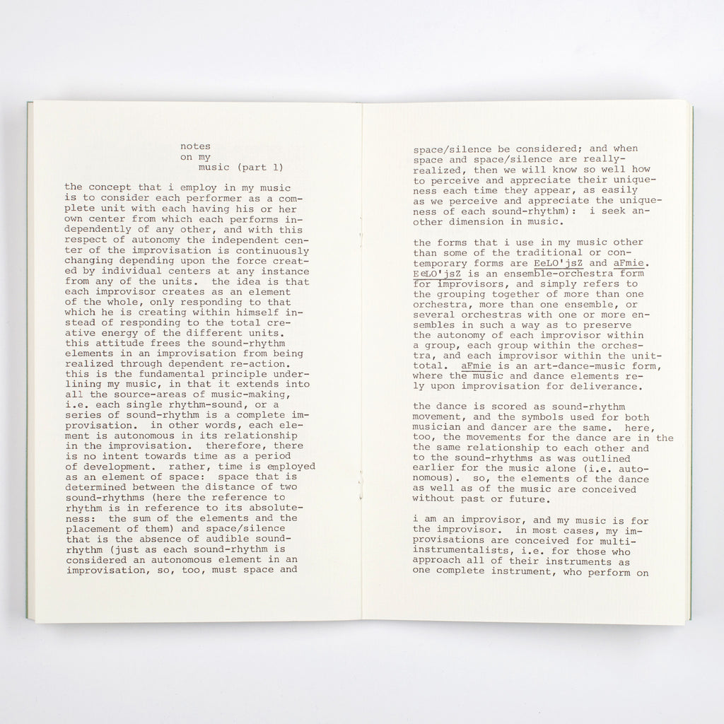 The book features Smith's original texts accompanied by three more recent essays: "Sounds," published in Abitare in July 2013; "The Creative Inspirational Moment," originally published in NYC Jazz Record in December 2011; and "Notes: My Thoughts in 2015," written for this publication. John Corbett, co-curator of the Renaissance Society exhibition, writes a new afterword.