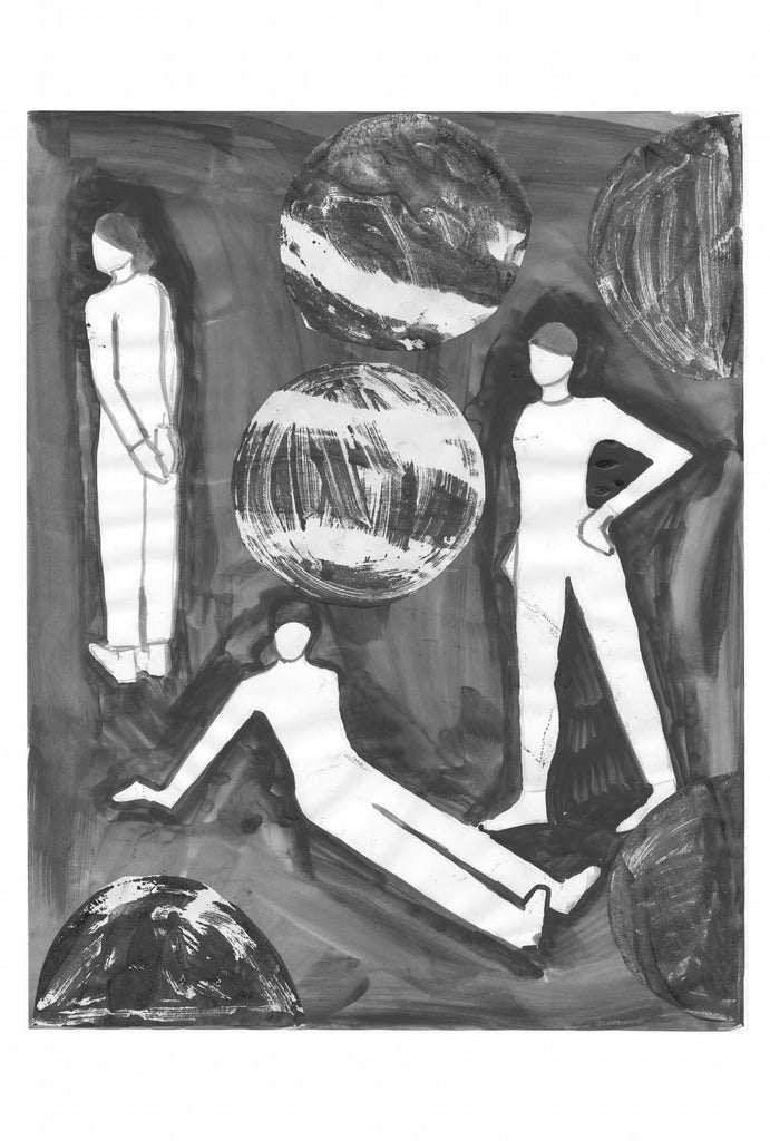 In the waiting room featured a group of six large-scale watercolor paintings by the Los Angeles-based German artist, situated in an arrangement of free-standing structures to form a kind of multidimensional stage set within the gallery. In some of Otto-Knapp’s works, silhouetted bodies stretch, ambulate, and contort, in the midst of a performance or preparing for one. Others introduce more scenic elements, reminiscent of the painted backdrops used on proscenium stages to ground actions within a particular setting. Rendered in grayscale with a single black pigment, each carries a certain enigmatic quality, the seeming simplicity of their reduced compositions belied by a deep conceptual framework and powerful sense of atmosphere.