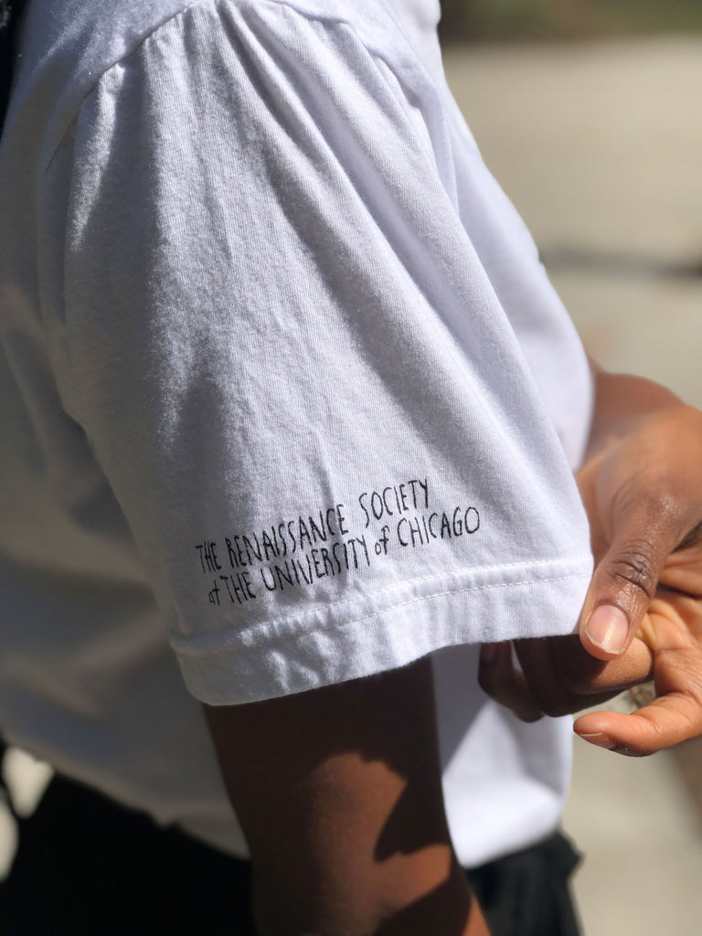 It’s printed on a white, 100% cotton unisex American Apparel crewneck, and also features “The Renaissance Society at the University of Chicago” written by the artist on the right sleeve.